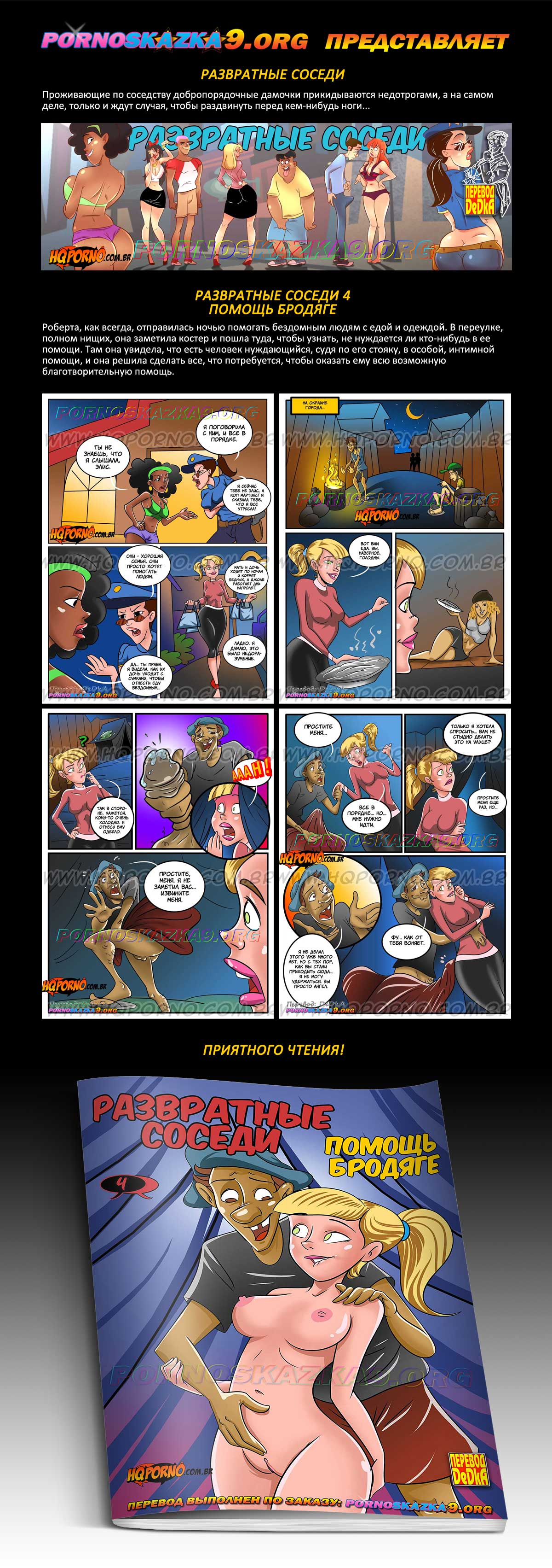 Порно комикс «Развратные соседи. Часть 4. Помощь бродяге.» Роберта, как всегда, отправилась ночью помогать бездомным людям с едой и одеждой. В переулке, полном нищих, она заметила костер и пошла туда, чтобы узнать, не нуждается ли кто-нибудь в ее помощи. Там она увидела, что есть человек нуждающийся, судя по его стояку, в особой, интимной помощи, и она решила сделать все, что потребуется, чтобы оказать ему всю возможную благотворительную помощь.