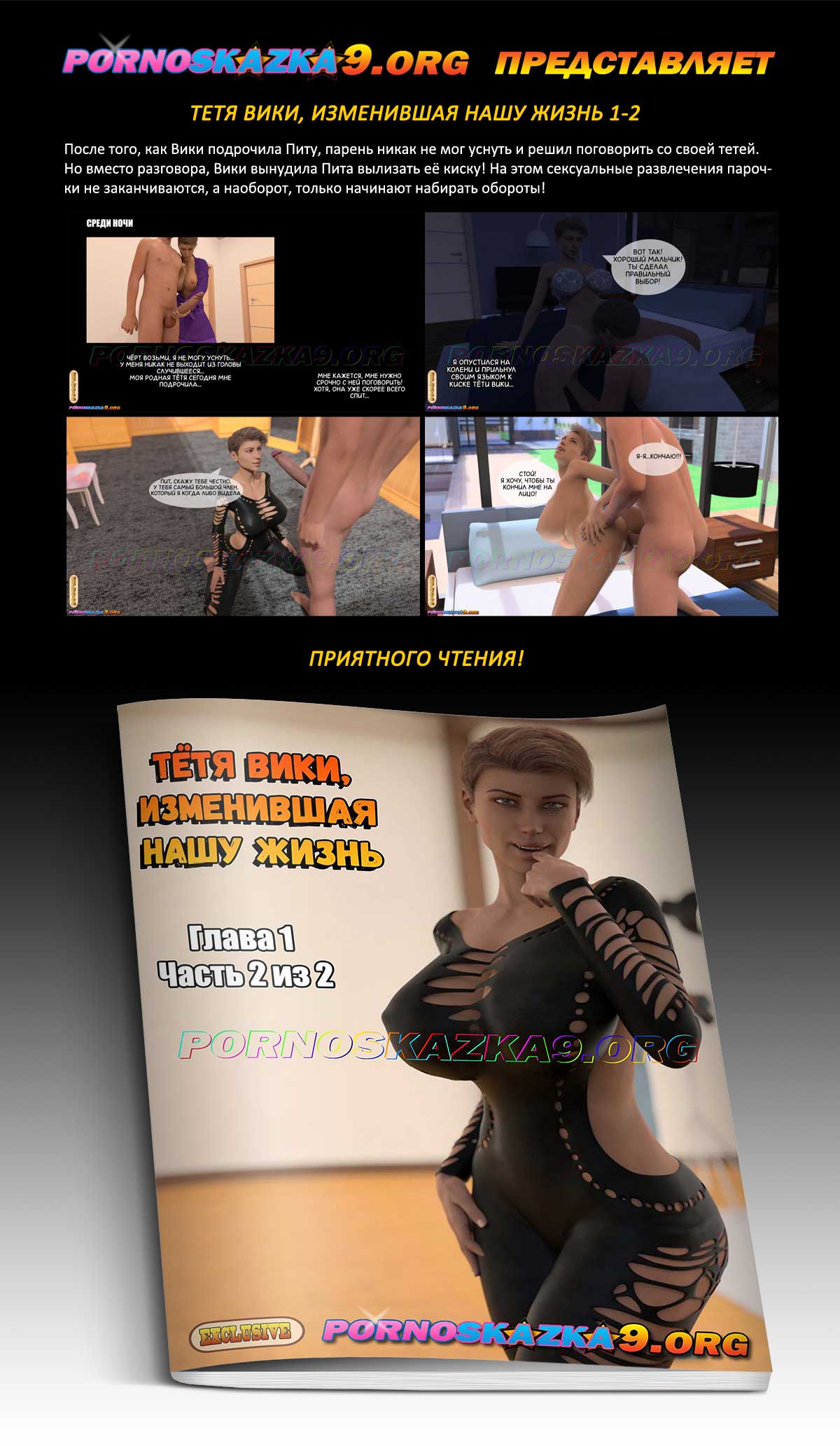 Порно комикс «Тетя Вики, изменившая нашу жизнь. Глава 1. Часть 2 из 2.» После того, как Вики подрочила Питу, парень никак не мог уснуть и решил поговорить со своей тетей. Но вместо разговора, Вики вынудила Пита вылизать её киску! На этом сексуальные развлечения парочки не заканчиваются, а наоборот, только начинают набирать обороты!